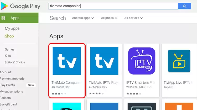 1. Tap on the search bar at the top and search for TiviMate Companion then select the first choice.